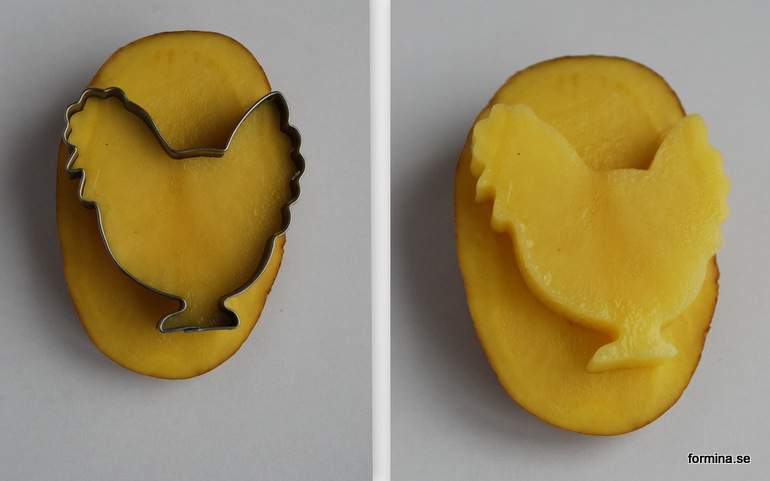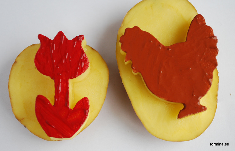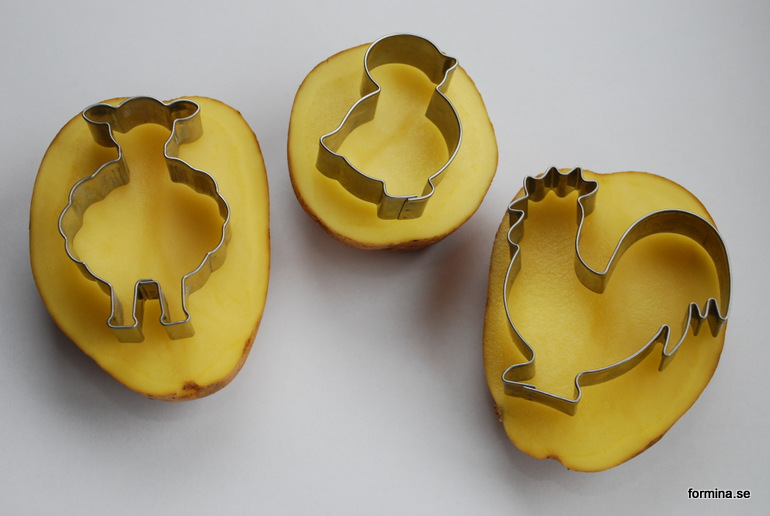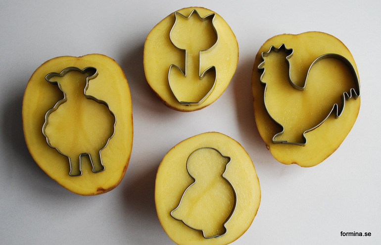 Ohjelmassa on varmasti hieman pääsiäisaskartelua. Kiva ja hieman erilainen tapa tehdä pääsiäiskortteja, on tehdä perunaleimasin. Käytä piparkakkumuotteja tehdäksesi tipu, kana, tulppaani tai… jokin muu hieno kuva perunaan. Kasta perunaleimasin musteeseen tai maalaa siveltimellä siten, että koko pinta on värjätty. Paina ja värjää uudelleen jokaisella kerralla saadaksesi parhaan mahdollisen kuvan.
